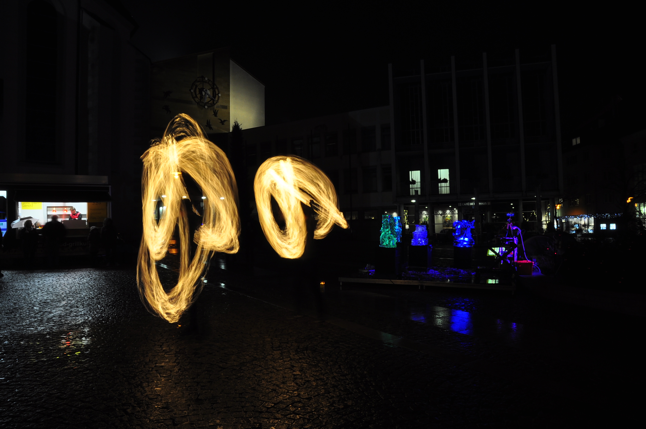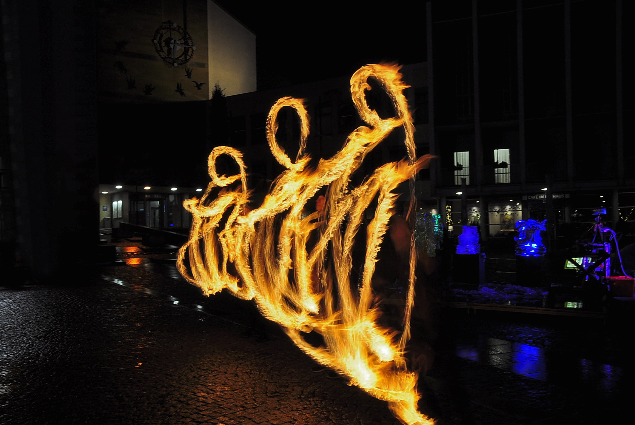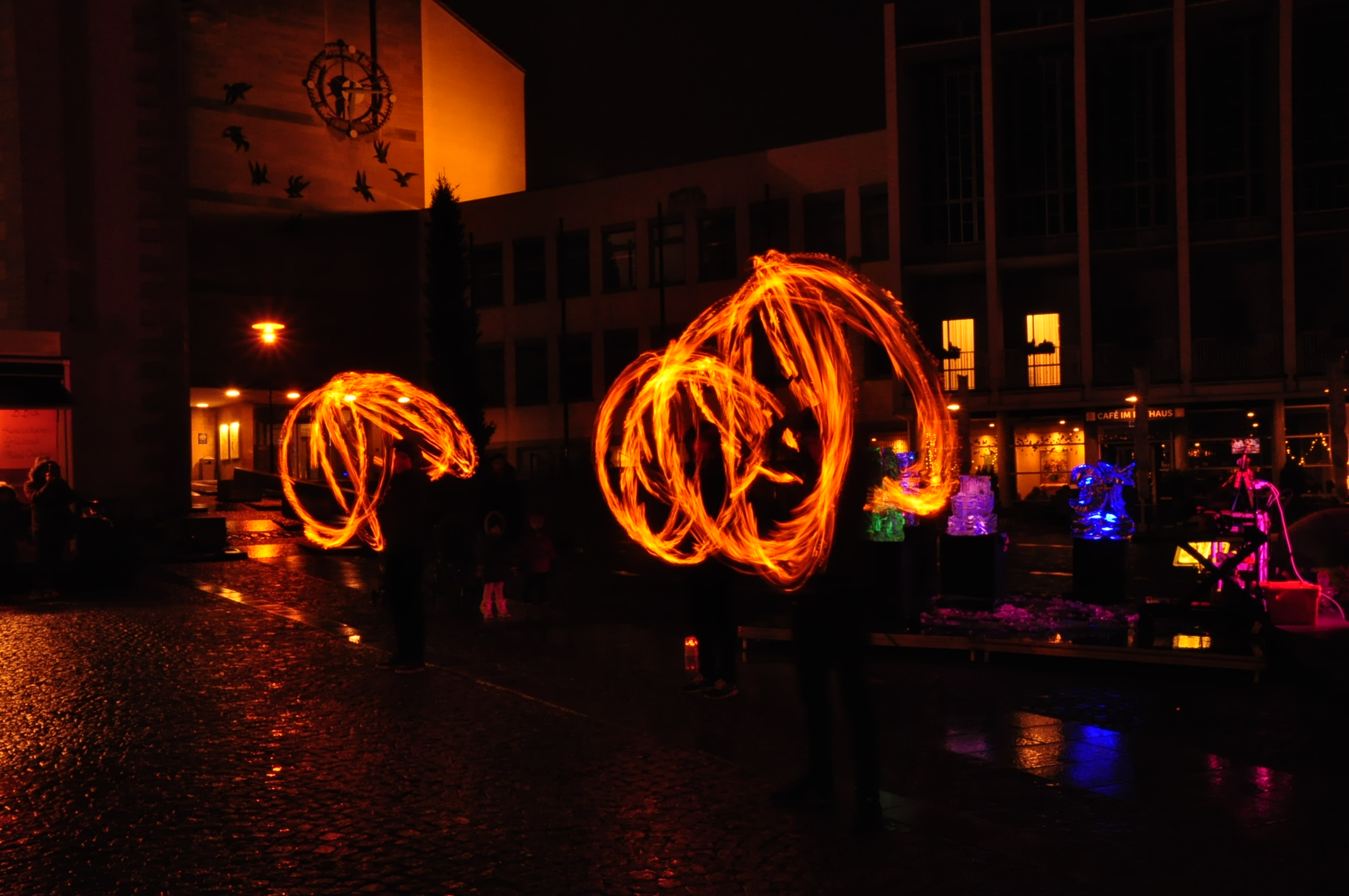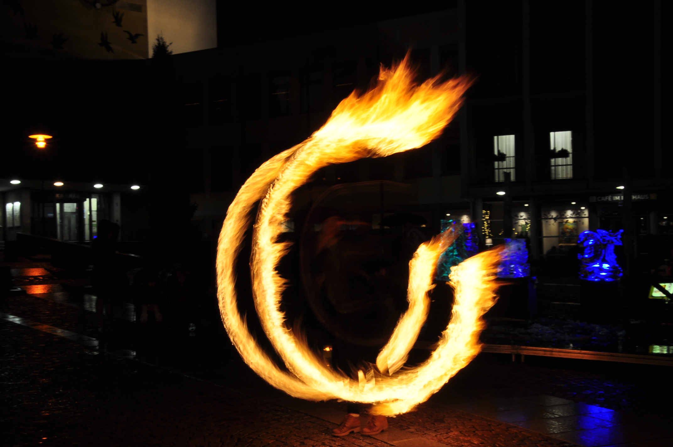 Feuer und Eis... auf dem Adenauerplatz in Friedrichshafen. Ein "Spiel" der Elemente. Die ZirkusAkademie "umspielt" den Eiskünstler.