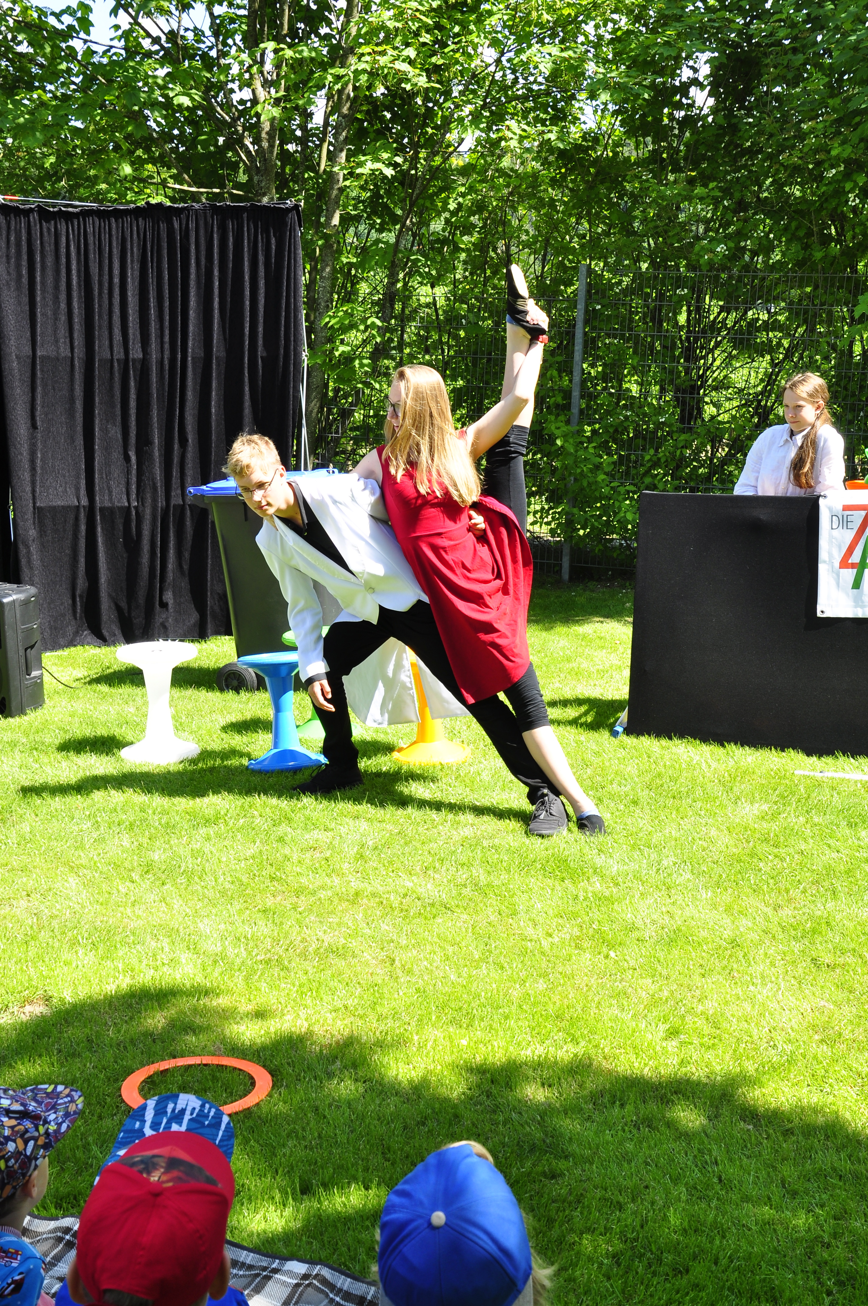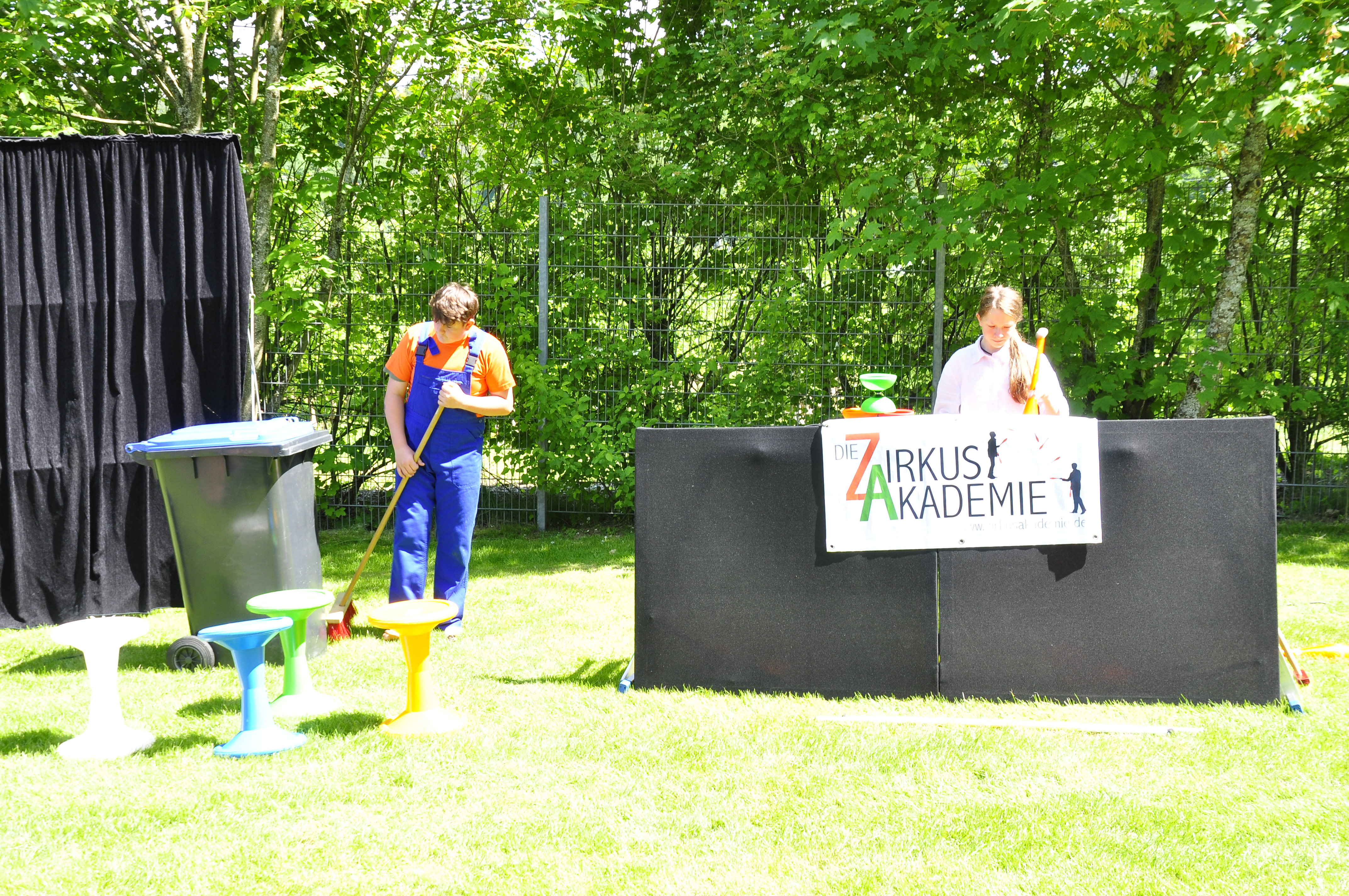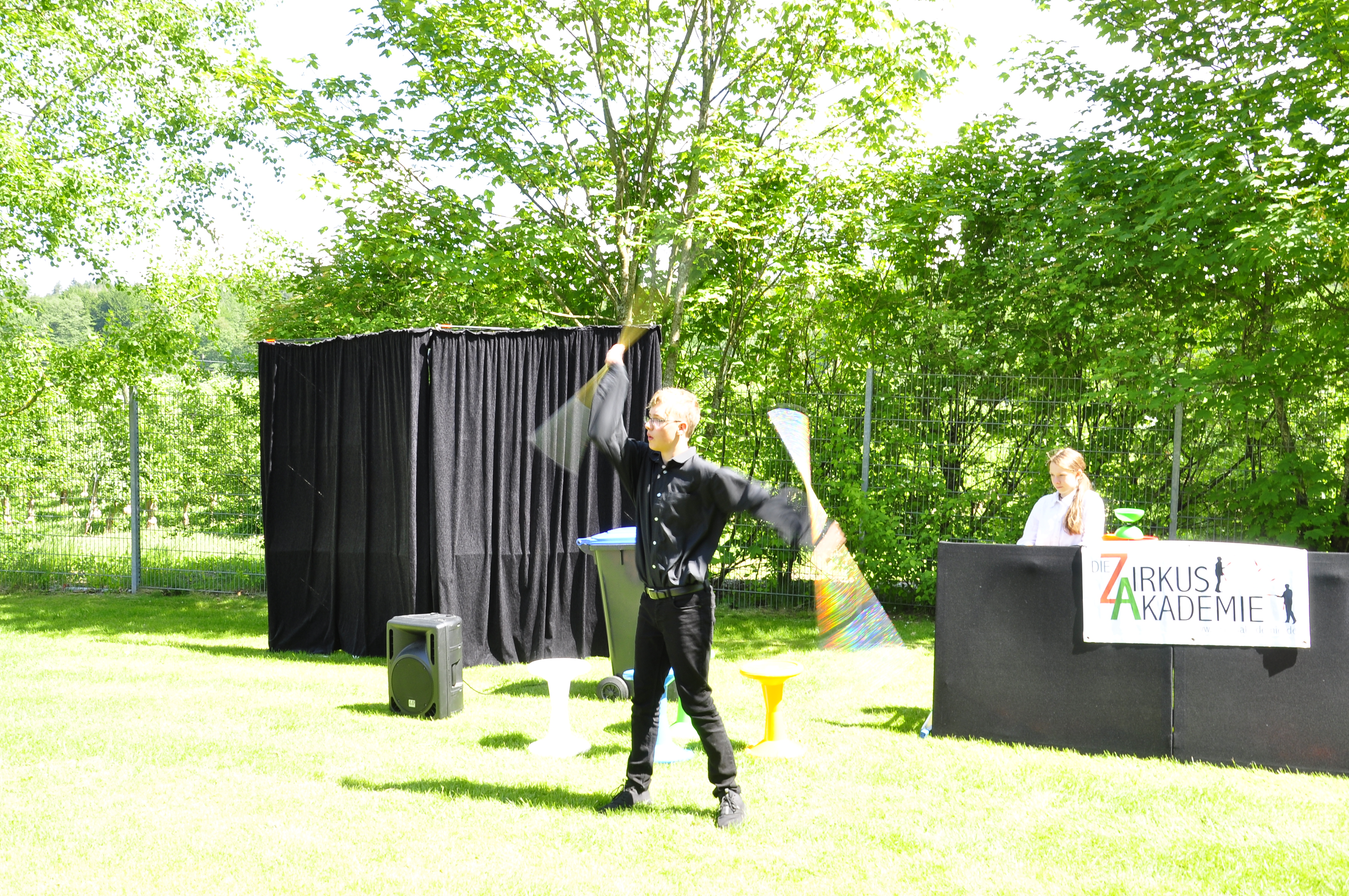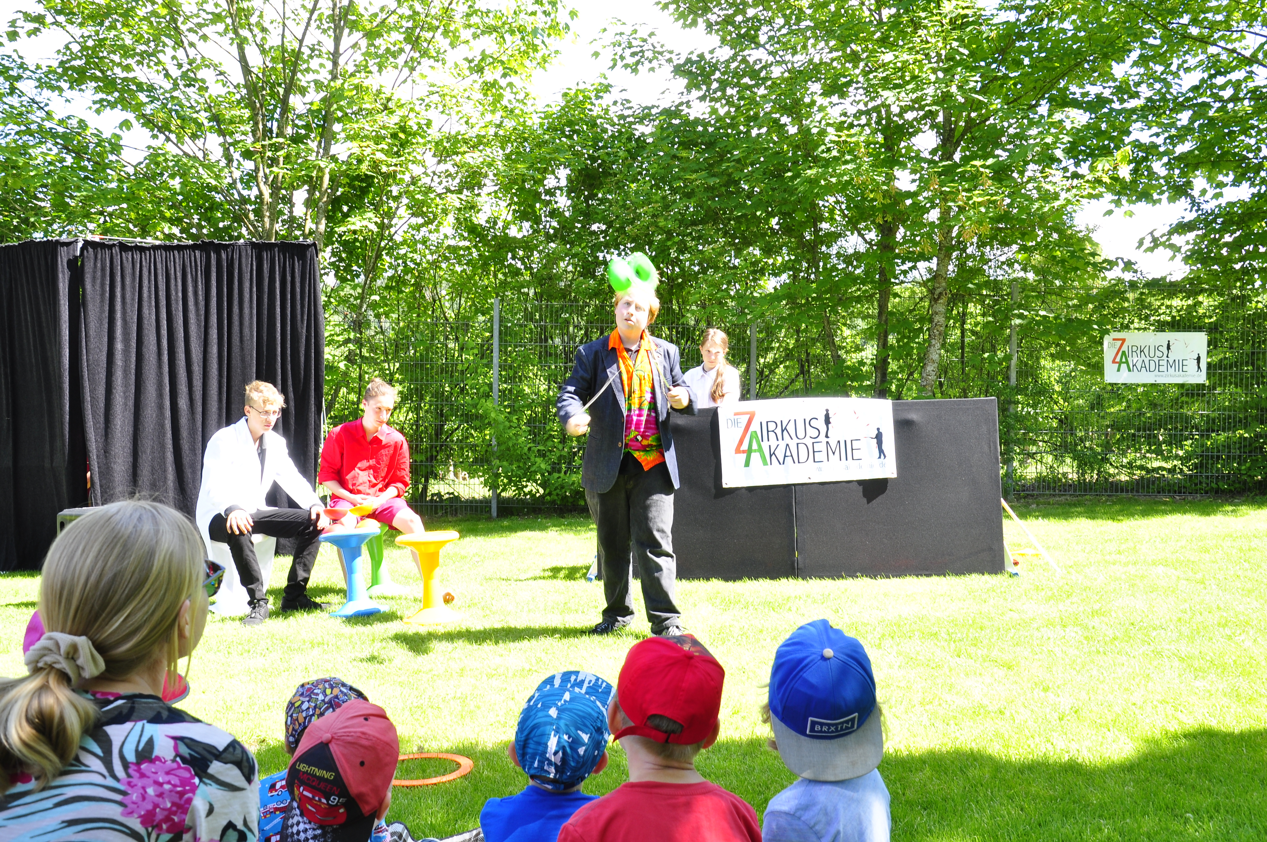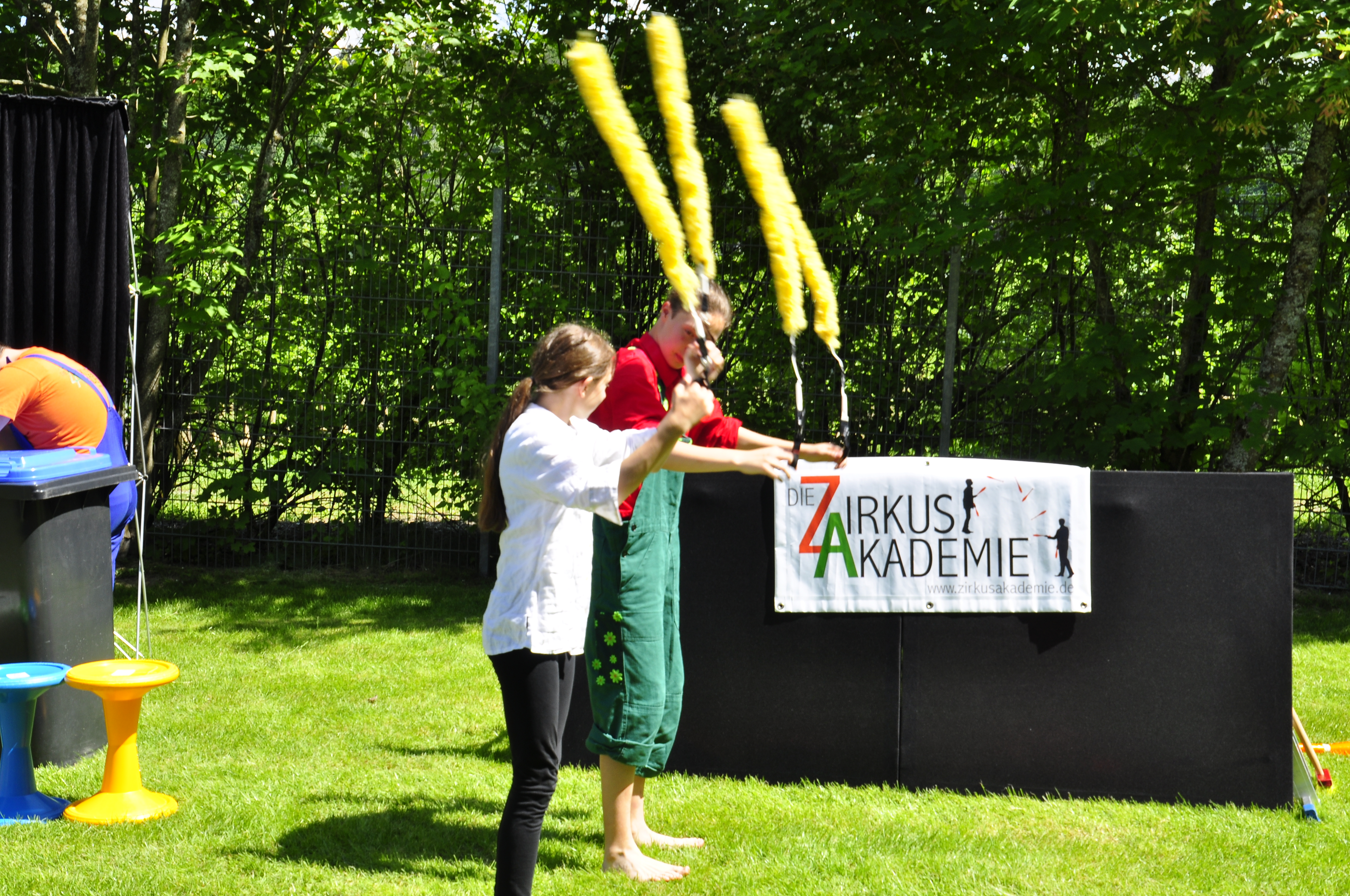 Die Zirkus-Tour-Gruppe im Bädle in Obereisenbach. Eine Vorstellung für den VauDe Kindergarten und Besucher.